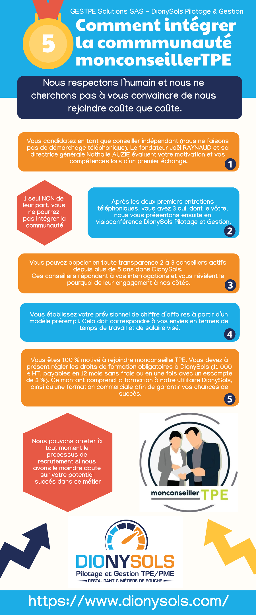 Chez monconseillerTPE, l'état d'esprit est complètement différent : une stratégie " Gagnant / Gagnant / Gagnant " qui est clairement affichée ! Le premier bénéfice à nous rejoindre est qu'il n'y a aucun droit d'entrée. Notre modèle économique est exclusivement basé sur le succès des conseillers en pilotage et gestion de TPE/PME ainsi que des clients utilisateurs de Dionysols (les deux premiers Gagnant / Gagnant). Plus les clients sont satisfaits grâce au savoir-être et savoir-faire du conseiller, plus ils achètent de licences DionySols, plus les équipes de GESTPE Solutions SAS éditeur de DionySols et mysolutionsWEB (le troisième Gagnant) sont capables de poursuivre avec eux cette belle aventure.